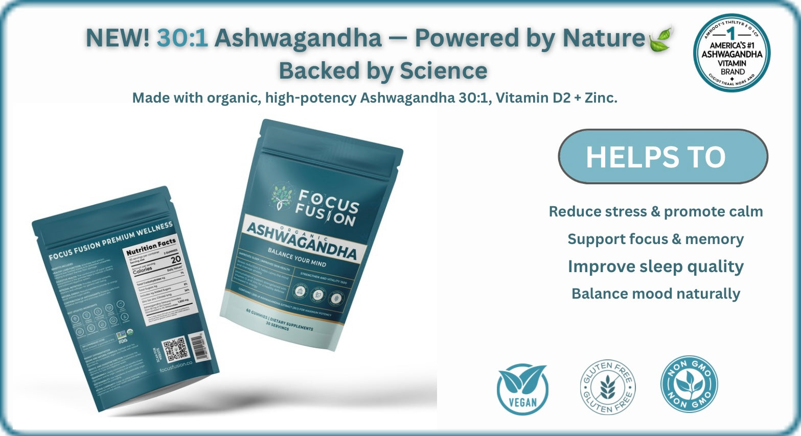 Each Focus Fusion gummy packs a concentrated 30:1 ashwagandha root extract, delivering the power of 1,500 mg of pure plant strength in just two gummies a day. Backed by science and made in GMP-certified labs, our formula ensures consistent quality you can count on.